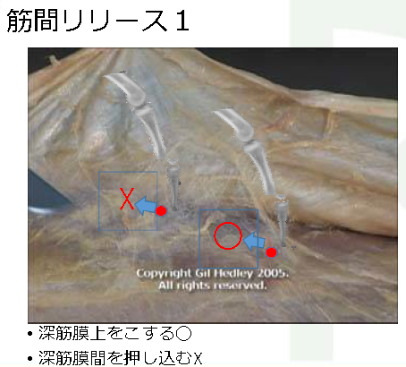 この技術を用いて、痛み、障害を引き起こしている原因因子への対策によりマルアライメントを矯正します。ISR®の対象組織となる筋間、組織間には下の写真のような疎性結合組織でつながっています。それが密になり、滑走性が低下した組織間にアプローチしていきます。