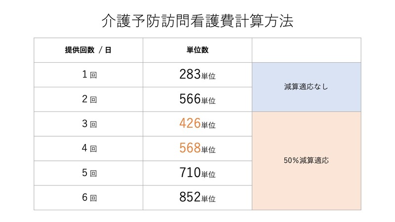 理学療法士、作業療法士又は言語聴覚士による介護予防訪問看護は、1日2回(3回以上)を超えて行う場合には1回につき所定単位数の100分の50 に相当する単位数を算定すること。なお、当該取扱いは、理学療法士、作業療法士又は言語聴覚士が連続して3回以上介護予防訪問看護を行った場合だけでなく、例えば午前中に2回、午後に1回行った場合も、同様である。