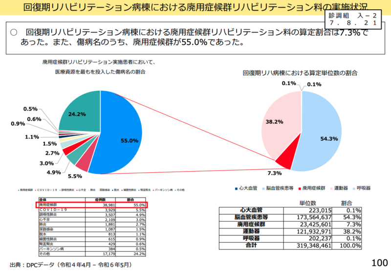 廃用症候群リハビリテーションについても、「7単位以上でFIM利得が小さくなる傾向が認められた」ことや、「かなり多くの廃用症候群リハビリテーションを実施している施設がある」ことを踏まえ、疾患別リハビリテーション料の算定上限単位数の在り方について検討が必要との意見があった。