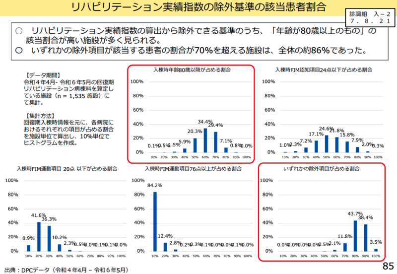 回復期リハビリテーション病棟のアウトカム評価指標である実績指数について、「80歳以上」や「認知機能が低い」患者の除外基準の見直しが議論された。調査結果では、実績指数から除外可能な要件のうち「年齢が80歳以上のもの」の該当割合が50%以上の施設が9割を超えている状況が明らかになった。