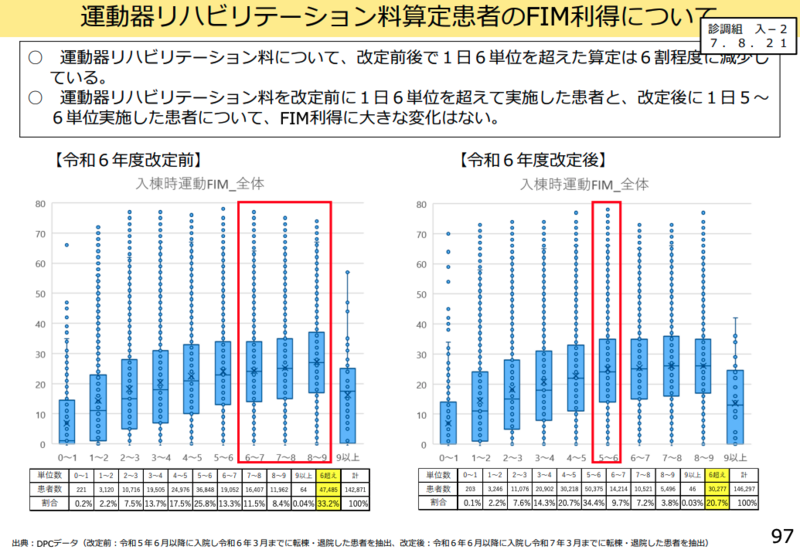 令和6年改定後も運動器リハビリテーション料について6単位を超えて実施している患者が相当数存在することが明らかになった。委員からは「単位数が増えてもFIM利得がほとんど変わっていないため、6単位を超えるリハビリを実施できる対象について、分析を深めてはどうか」との意見が出された。