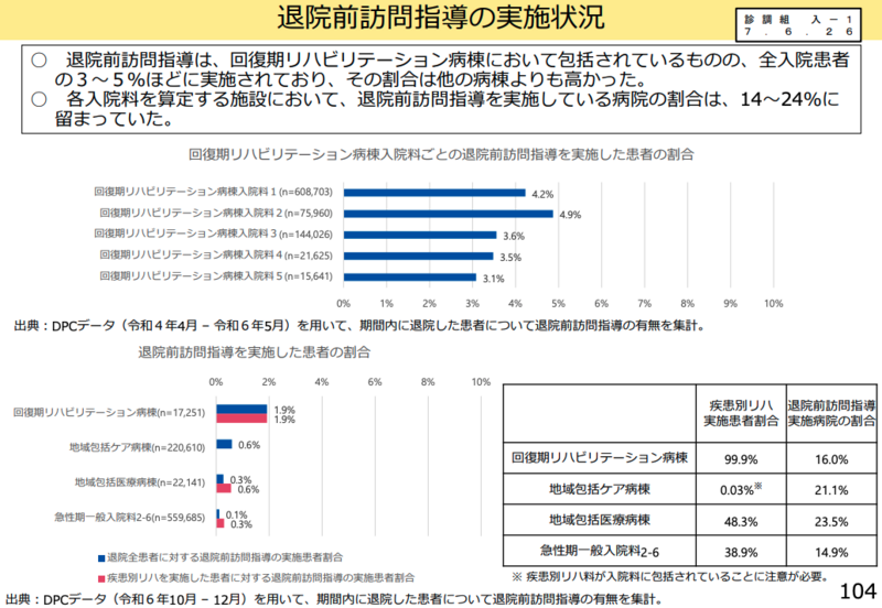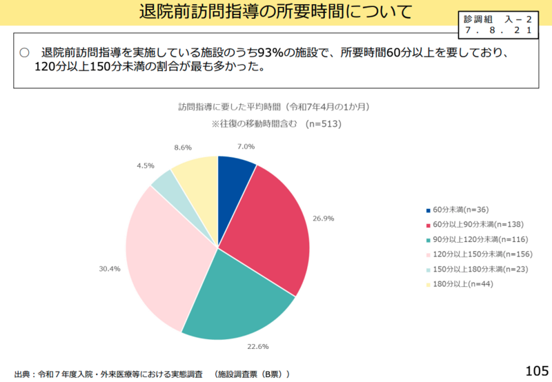 退院前訪問指導については、回復期リハビリテーション病棟における実施割合は3~5%程度だが、多職種で約半日を費やして行っている実態が明らかになった。委員からは「労力に見合うよう評価されれば、より実施されるのではないか」「60分以上かけて行っている施設が9割を超えており、実施内容を踏まえた適切な評価方法について検討を進めるべき」との意見が出された。