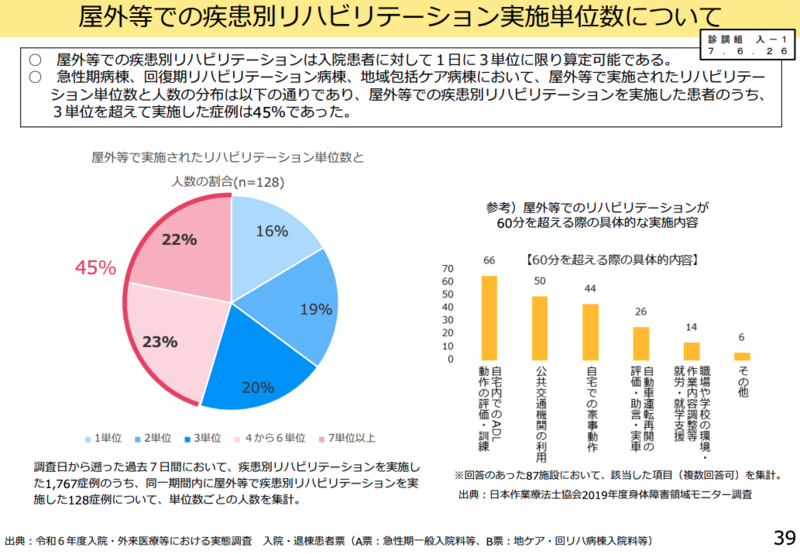 社会復帰のための屋外等でのリハビリテーションについて、現在は1日3単位までという制限があることについて、委員からは「社会復帰のための施設外でのリハビリテーションは重要であり、1日3単位までという単位数の上限は見直すべき」との意見が示された。