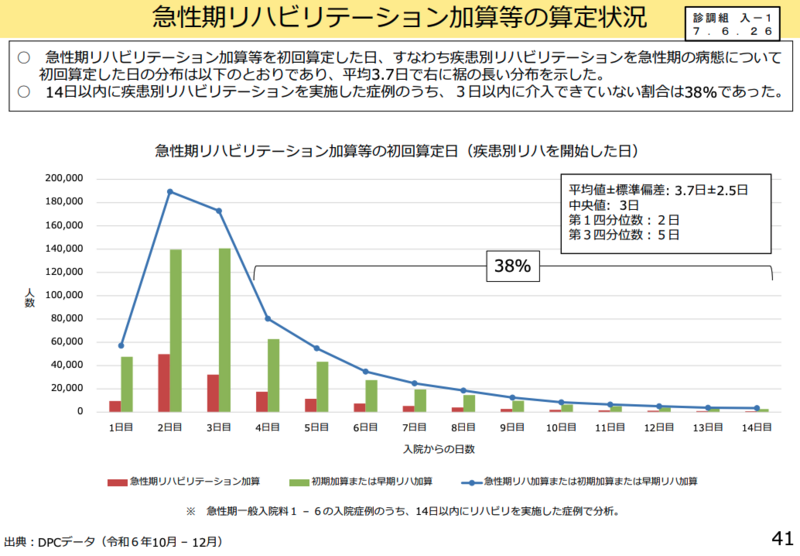 急性期でのリハビリテーション開始について、14日以内に疾患別リハビリテーションを実施した症例のうち、3日以内に介入できていない割合が38%に上ることが明らかになった。