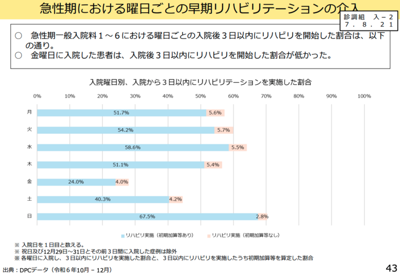 委員からは「急性期のリハビリテーションでは、入院直後からなるべく早くリハビリテーションを開始することが重要」「より早期の在宅復帰につなげるためにも、入院直後からリハビリテーションを開始して、土日も含めて中断しないようにすることを急性期リハビリテーション加算等の算定要件として検討しても良いのではないか」との意見が出された。