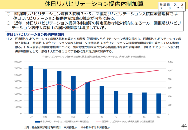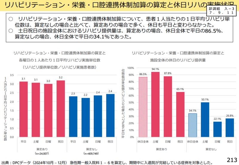 委員からは「土日祝日に提供するリハビリテーション単位数が平日の8割以上であることの要件が厳しすぎるのではないか」「体制加算に取り組みたい医療機関は多いものの、人員配置等の施設基準が厳しいため、算定が伸び悩んでいるのではないか」との指摘があった。