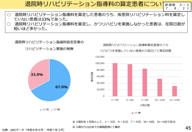 退院時リハビリテーション指導料について、現状では疾患別リハビリテーション料を算定していない患者が33%を占めていることが明らかになった。