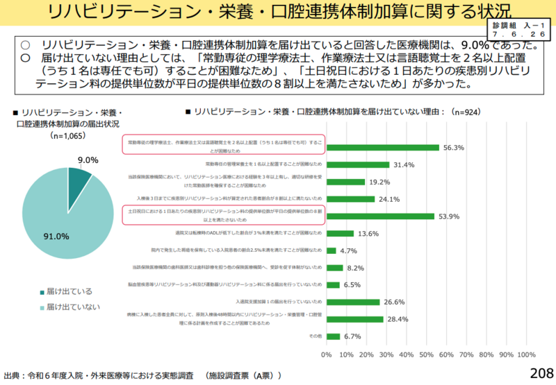 取りまとめでは、リハビリテーション・栄養・口腔連携体制加算(体制加算)を届け出ている医療機関が9.0%にとどまっている現状が示された。届出していない理由として、「常勤専従の理学療法士、作業療法士又は言語聴覚士を2名以上配置することが困難」「土日祝日における1日あたりの疾患別リハビリテーション料の提供単位数が平日の提供単位数の8割以上を満たさない」が多く挙げられた。