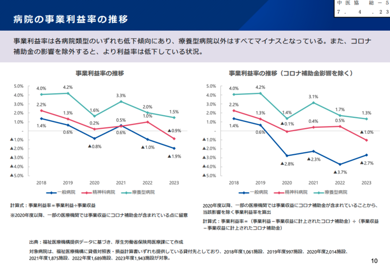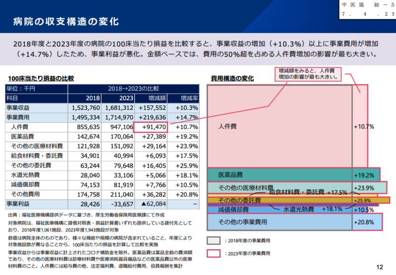 厚生労働省が提示したデータによると、2018年度と2023年度の病院100床当たり損益比較では、事業収益の増加(10.3%)を大幅に上回って事業費用が14.7%増加した。