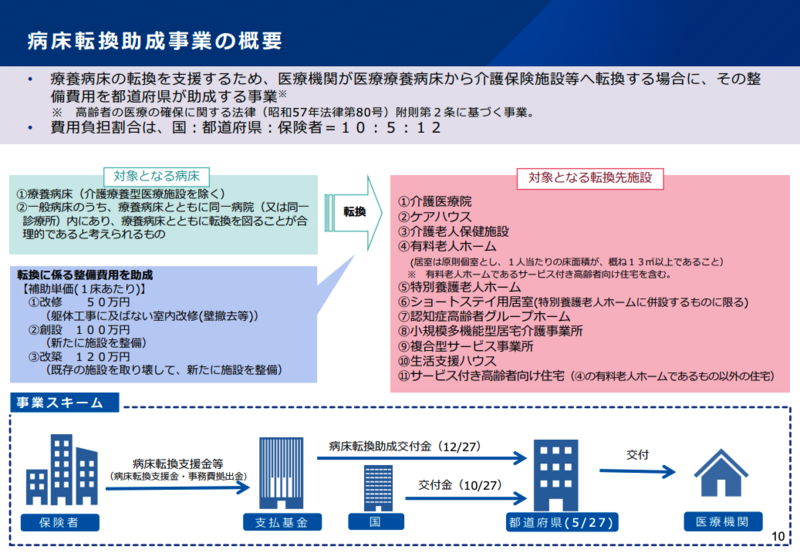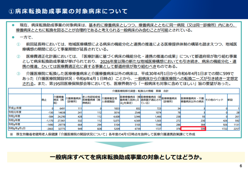 病床転換助成事業については、事務局から現行の令和7年度末までの期限を令和11年度末(2029年度末)まで延長する方針が示された。同時に、対象病床を一般病床すべてに拡大し、補助単価を改修120万円、創設240万円、改築300万円に引き上げる見直し案が提示された。
