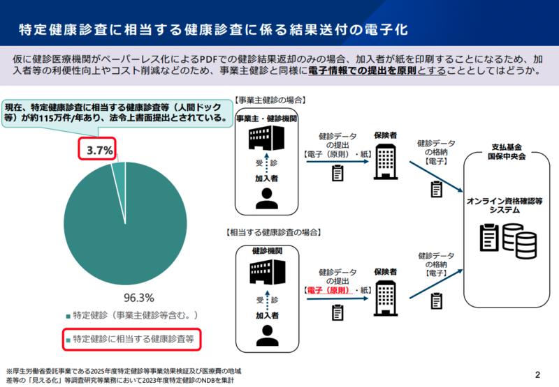特定健康診査に相当する健康診査(人間ドック等)の結果送付について、現在は法律上書面での提出とされているが、事業主健診と同様に電子情報での提出を原則とする方針が示された。
