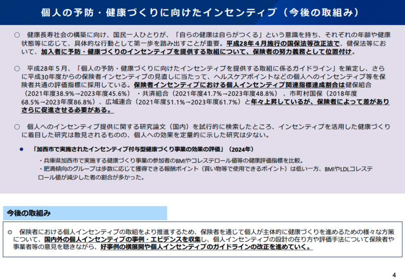 個人の予防・健康づくりに向けたインセンティブについて、事務局は今後の取組として、国内外の事例やエビデンスを収集し、好事例の横展開や個人インセンティブのガイドラインの改正を進めていく方針を示した。