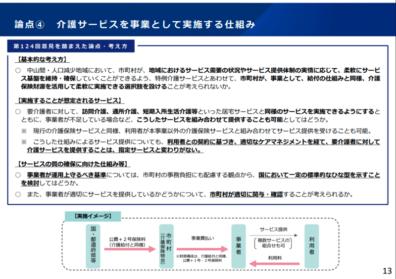 さらに事務局は、市町村が介護サービスを事業として実施し、給付と同様に1号・2号保険料を含めた介護保険財源を活用できる選択肢を設けることも提案した。