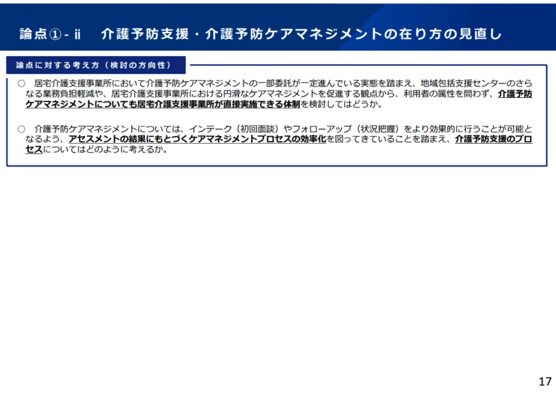 全国老人保健施設協会の東憲太郎委員は「私は以前から介護予防に関しては居宅介護支援事業所に引き渡すべきと提案発言をしてきた」とし、介護予防支援についても地域包括支援センターの手を離して居宅介護支援事業所に委ねることを提案した。
