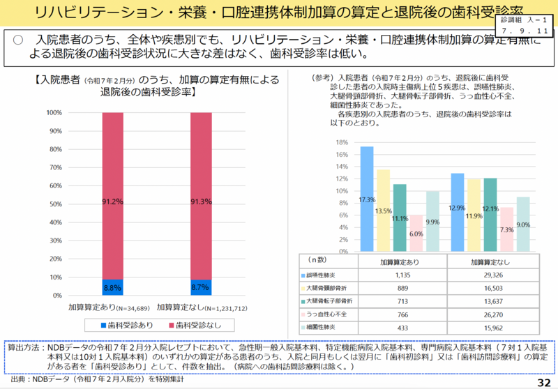 厚生労働省が提示したNDBデータ(令和7年2月入院分)によると、入院患者のうち、リハビリテーション・栄養・口腔連携体制加算の算定有無による退院後の歯科受診状況に大きな差はなく、歯科受診率は低いことが明らかになった。
