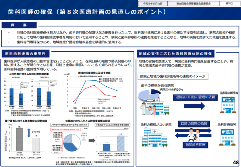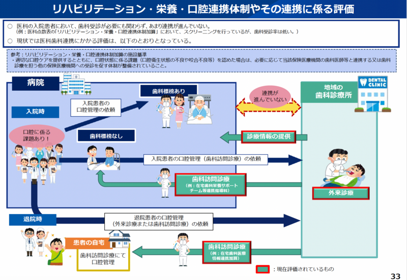 資料では、医科の入院患者において歯科受診が必要にもかかわらず、あまり連携が進んでいないことが問題として提起された。