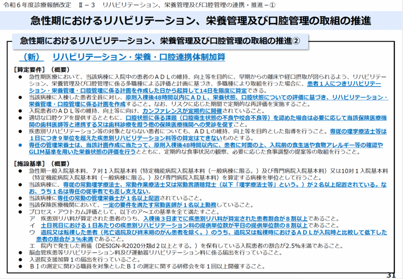 リハビリテーション・栄養・口腔連携体制加算(120点/日、14日間を限度)は、令和6年度改定で新設された。急性期一般入院基本料、特定機能病院入院基本料(7対1または10対1)、専門病院入院基本料(7対1または10対1)を算定する病棟を対象に、入院患者のADL維持・向上を目的とした取り組みを評価するものである。
