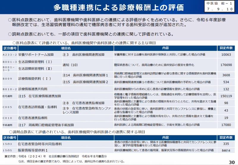 令和6年度改定では、生活習慣病管理料の療養計画書「問診」欄に歯科の受診状況をチェックする項目が追加され、糖尿病患者に対して歯周治療のために歯科受診を推奨することが要件化されている(算定件数176,698件)。