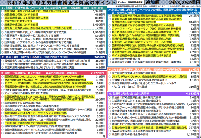 厚生労働省事務局は、閣議決定された令和7年度補正予算案のうち、厚生労働省関係の「医療・介護等支援パッケージ」として総額1兆3,649億円(うち医療分1兆368億円)を計上したことを報告しました。
