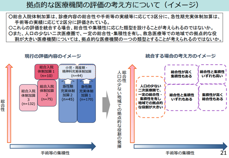 事務局は、総合入院体制加算(1~3)と急性期充実体制加算(1・2)を統合し、「総合性」(診療科の幅広さ)と「集積性」(手術件数等の実績)の2軸で病院を分類するイメージを提示しました。