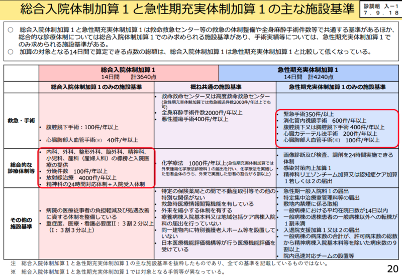 現行の総合入院体制加算1(14日間計3,640点)と急性期充実体制加算1(14日間計4,240点)は、救命救急センター等の救急体制や全身麻酔手術件数2,000件以上などで共通する基準がある一方、総合入院体制加算1では7診療科(内科・外科・整形外科・脳神経外科・精神科・小児科・産科または産婦人科)の標榜と入院医療の提供が求められ、急性期充実体制加算1では消化管内視鏡手術600件以上、心臓カテーテル法手術200件以上など、より詳細な手術実績が要件となっています。