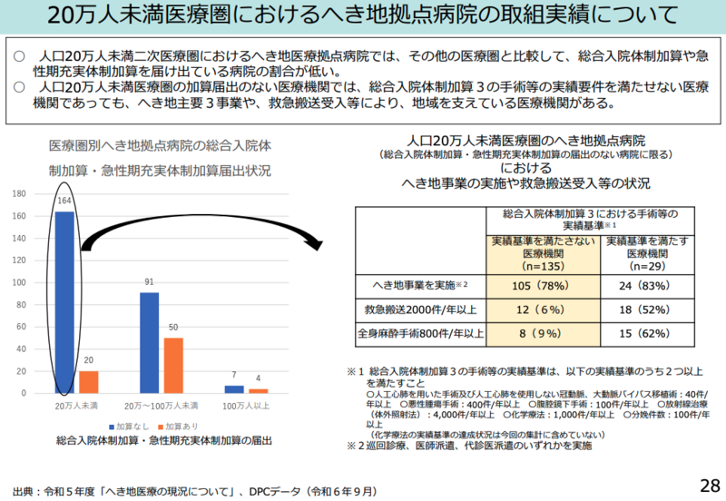 人口20万人未満の二次医療圏では、救急搬送件数が2,000件未満でも地域の救急医療を支える砦となっている病院があることが示されました。人口20万人未満医療圏のへき地医療拠点病院164施設のうち、総合入院体制加算・急性期充実体制加算のいずれも算定できていない状況が報告されています。
