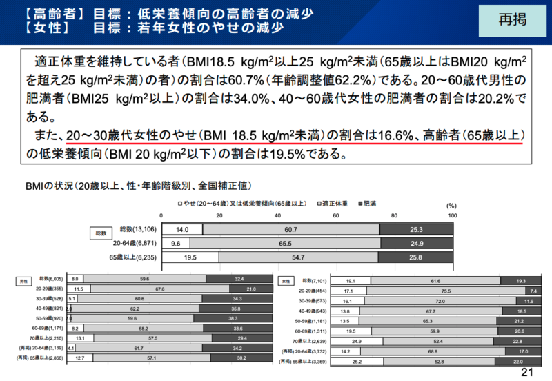地域リハビリテーションの核心となる高齢者のデータも確定しました。 65歳以上の低栄養傾向(BMI20以下)は19.5%。70歳以上の女性に限ると24.9%と、実に4人に1人が低栄養リスクを抱えています。