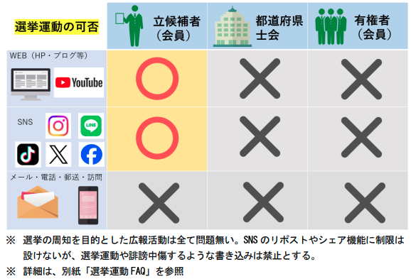 選挙運動は立候補者本人のみに認められ、有権者による選挙運動は禁止されている。WebサイトやSNS(X、Facebook、LINE、YouTube等)での活動は立候補者に限り可能だが、電子メール・電話・郵送・訪問による投票依頼は立候補者・有権者を問わず一切禁止となる。