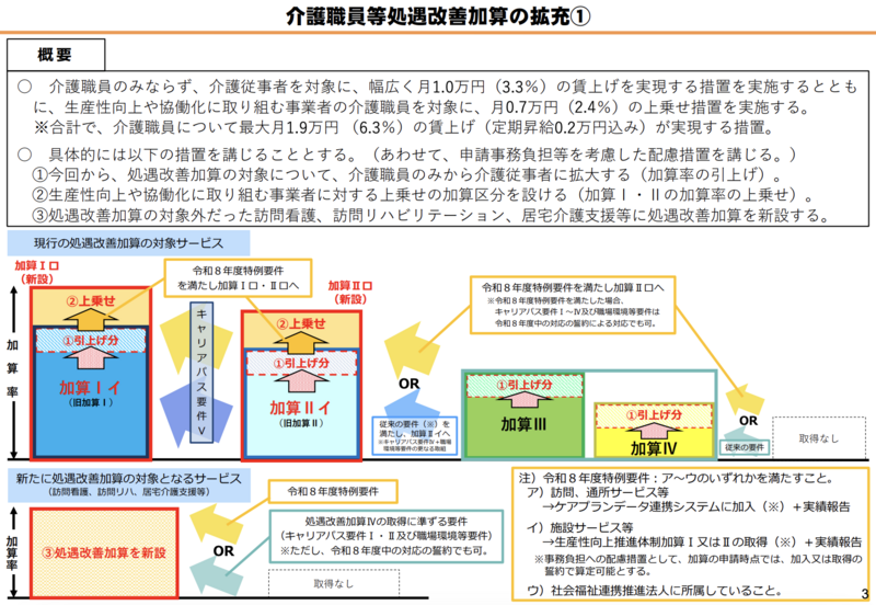 介護職員等処遇改善加算の対象は、従来の介護職員に加え、介護支援専門員や看護職、リハビリテーション専門職などの「介護従事者」へと拡大される。ただし、賃上げの具体的な配分方法は事業所の判断に委ねられる。
