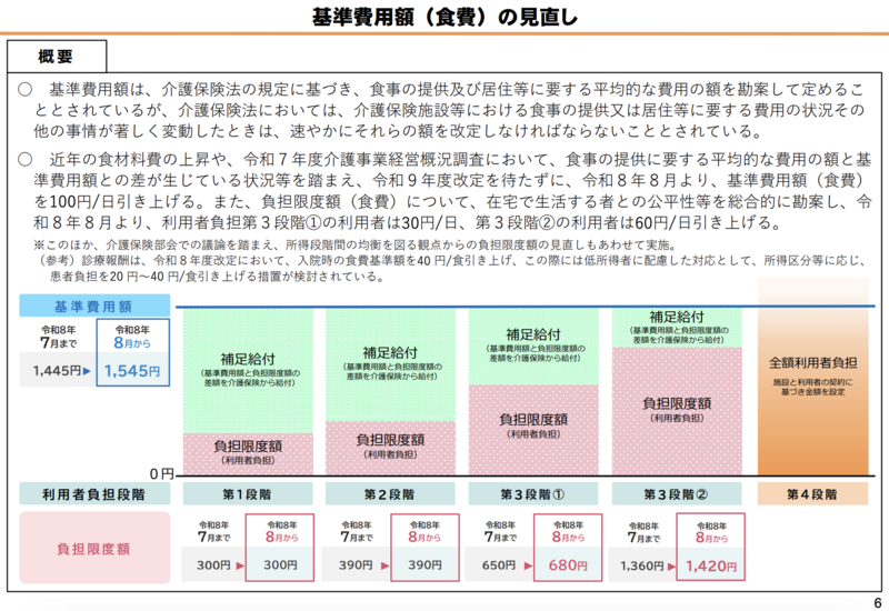 食費についても改定が行われる。介護保険施設等における基準費用額を1日あたり100円引き上げ、1,445円から1,545円とする。施行は令和8年8月から。