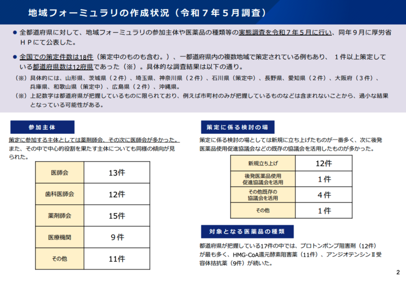 令和7年5月に実施された調査によると、地域フォーミュラリの策定件数は全国で18件、1件以上策定している都道府県は12府県にとどまっています。