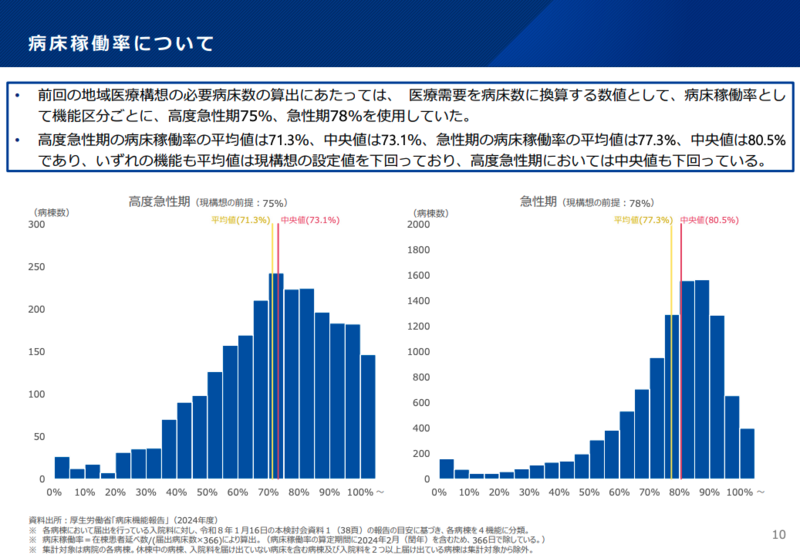 旧来の地域医療構想では高度急性期75%、急性期78%といった稼働率を算定の基礎として使用してきたが、直近の実態データ(2024年度・病床機能報告)では高度急性期の平均値71.3%(中央値73.1%)、急性期の平均値77.3%(中央値80.5%)と、設定値を軒並み下回っていた。回復期にあたる包括期も平均値78.9%(中央値84.2%)、慢性期は平均値85.6%(中央値90.1%)と、いずれも現構想の設定値を下回っている。