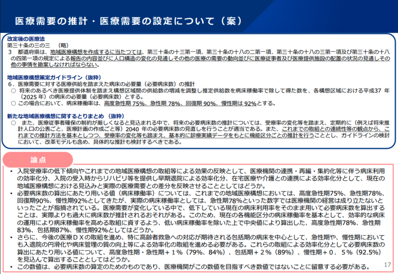 今回の最大の焦点は、必要病床数の算定に用いる病床稼働率の見直しだった。