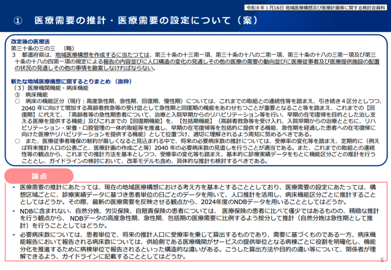 - 令和8〜9年度上半期(2026〜2027年):構想区域ごとに現状把握・必要病床数の設定・医療機関機能の確保等の課題設定