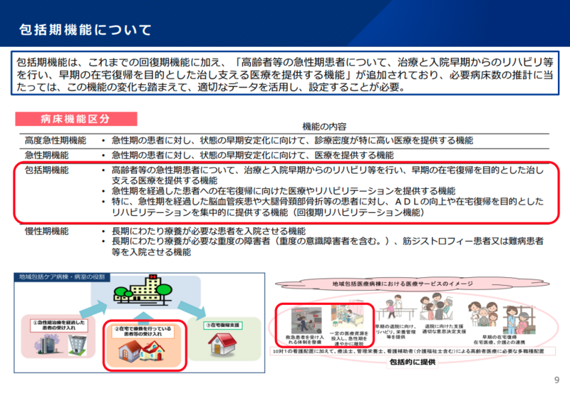 包括期は従来の回復期機能に加え、「高齢者等の急性期患者を受け入れ、入院早期からリハビリテーション・栄養・口腔管理の一体的取組を推進し、早期の在宅復帰等を包括的に提供する機能」が追加された点が特徴で、この機能定義がガイドライン取りまとめ文書に明示された。