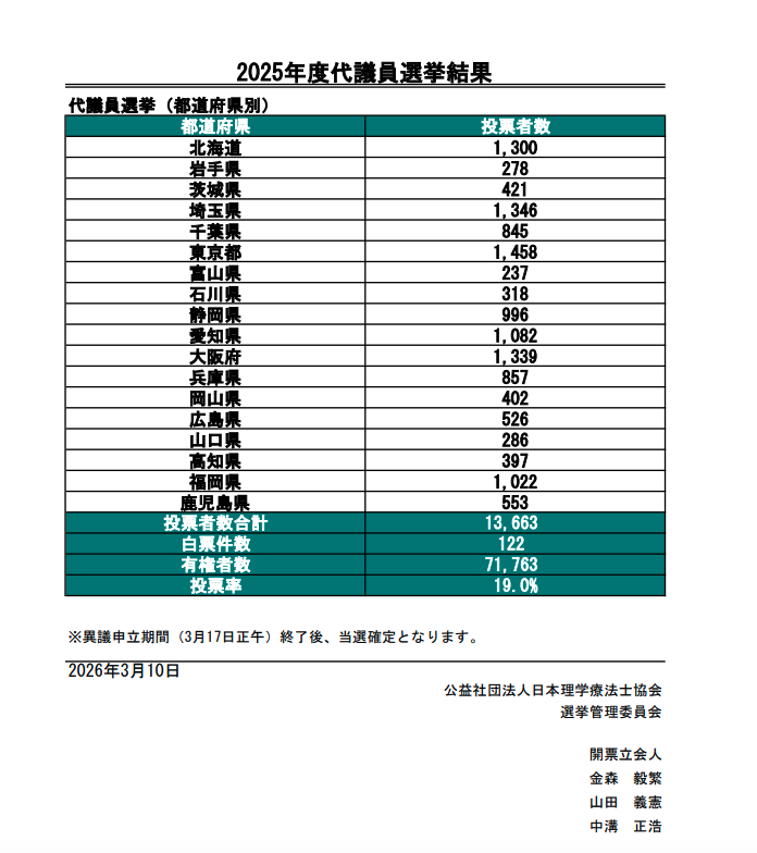 日本理学療法士協会の2025年度代議員選挙が3月10日正午に投票を締め切った。18都道府県・有権者71,763人を対象に実施され、投票率は19.0%(投票者数13,663人)。前回2023年度選挙の約16%から約3ポイント上昇した。当選確定は異議申立期間が終了する3月17日正午となる。