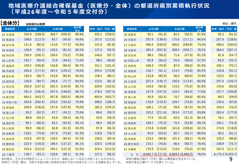 医療分野の2014~2023年度の10年間における交付総額は8,493億円(うち国費5,717億円)、執行総額は6,664億円で、全体の執行率は78.5%。前年度までから2.1ポイント上昇しました。