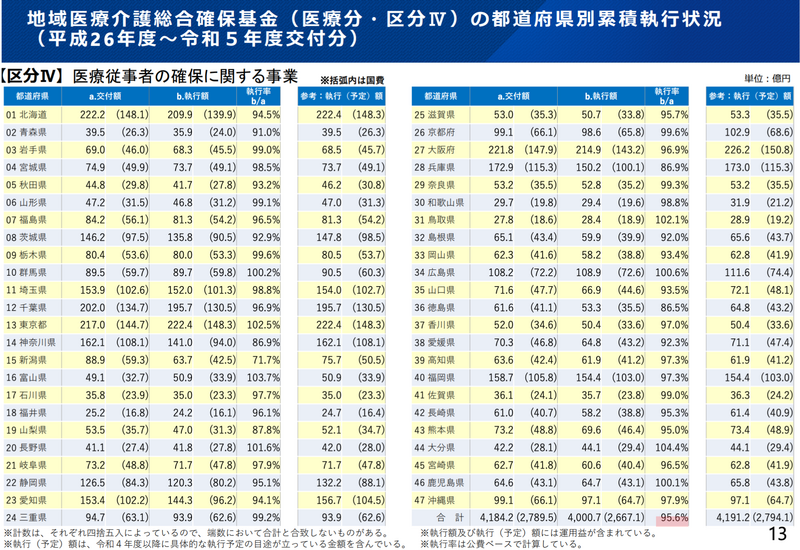 注目すべきは事業別の執行率の差です。医療従事者の確保に関する事業(区分Ⅳ)は95.6%に達し、事実上の「使い切り」状態にあります。一方、勤務医の労働時間短縮に向けた体制整備(区分Ⅵ)は51.4%にとどまり、2020年度に新設された比較的若い事業であることを差し引いても、低い水準です。施設・設備整備(区分Ⅰ-1)も56.5%で、建築費高騰が計画見直しを迫っている実態が浮かびます。