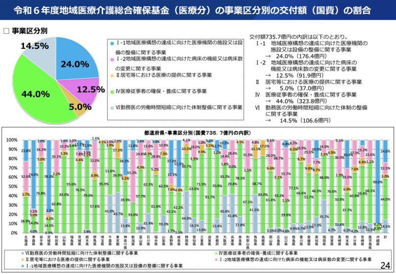 令和6年度の交付額ベースで見ると、医療従事者確保が44.0%と最大のシェアを占め、勤務医の時短体制整備は14.5%(前年度から11.0ポイント増)と急拡大しています。