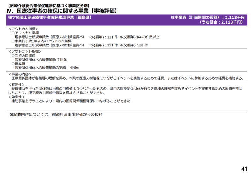 なお、福島県では基金を活用した「理学療法士等医療従事者確保推進事業」の事後評価が報告され、理学療法士の新規免許申請数がR4年の111件からR5年に120件へ増加した実績が示されました。PT/OT/STの確保に基金が直接活用されている具体例として注目に値します。