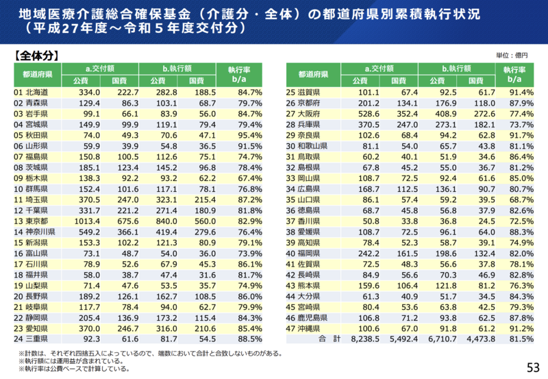 介護分野(2015~2023年度)の交付総額は8,239億円(うち国費5,492億円)、執行総額は6,711億円で、執行率は81.5%(前年度から4.2ポイント上昇)でした。