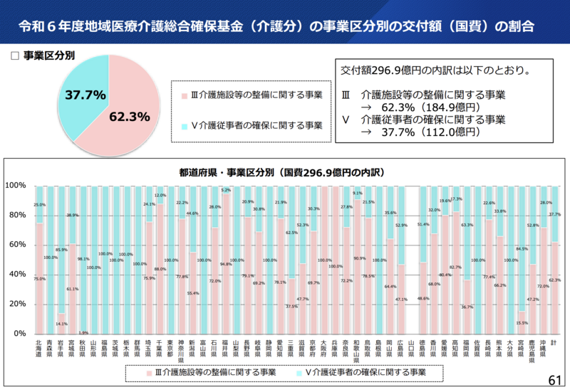 事業別では施設整備(区分Ⅲ)が78.4%、人材確保(区分Ⅴ)が88.7%。特筆すべきは、令和6年度の交付額における施設整備と人材確保の比率です。人材確保事業のシェアは37.7%まで拡大しました。多くの都道府県が介護人材の確保・定着に予算を振り向けざるを得ない状況が読み取れます。