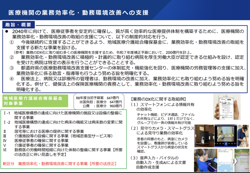 会議では、医療機関の業務効率化・勤務環境改善に関する制度対応も報告されました(資料3)。基金に「業務効率化・勤務環境改善に関する事業」が新区分として加わる予定です。なお、令和8年度の基金(医療分)全体の予算案は公費ベースで960億円(うち国費647億円)が計上されています。業務のDX化として、スマートフォンによる情報共有、見守りカメラ・スマートグラスの活用、音声入力や生成AIによる文書作成支援などの取組例が示されました。