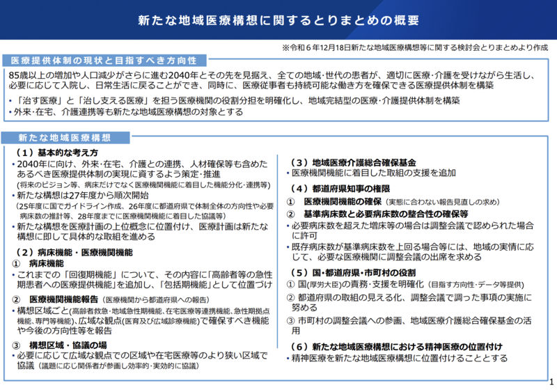 改正医療法に基づく新たな地域医療構想の関連規定は2027年4月に施行されます。これに合わせ、総合確保方針の改正、基金への新区分追加など一連の法令整備が進む見通しです。都道府県では2026年度に医療提供体制全体の方向性や必要病床数の推計を行い、2028年度までに医療機関機能に着目した協議を完了させるスケジュールとなっています。