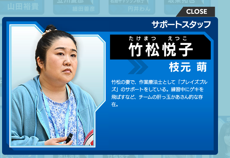 キャラクター説明には「練習中にゲキを飛ばすなど、チームの肝っ玉かあさん的な存在」とあります。選手の妻、そしてOTとしての専門性──二つの立場からチームを内側で支える人物像が読み取れます。