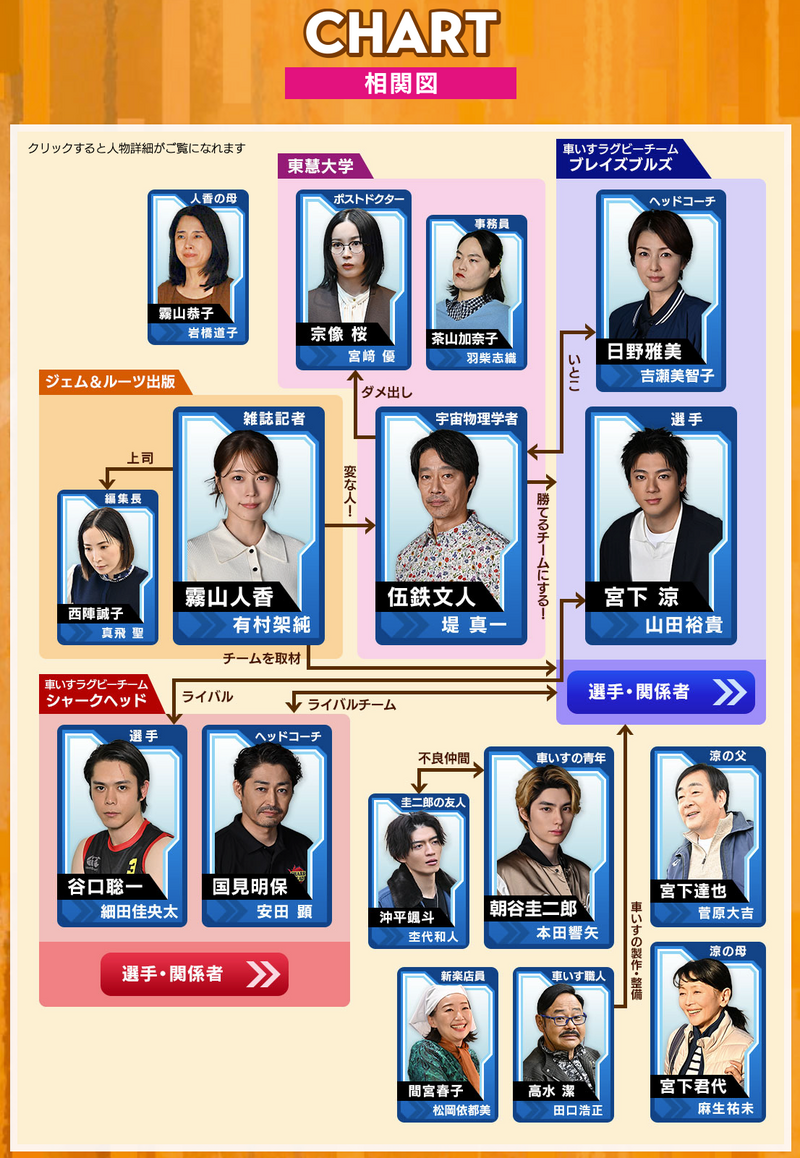 公式相関図によると、竹松悦子(たけまつ・えつこ)はブレイズブルズのサポートスタッフとして配置されています。演じるのは枝元萌さん。ブルズの選手・竹松健治(演:やす)の妻であり、作業療法士としてチームをサポートする役どころです。