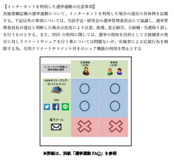 SNSの運用にも細かい制約があります。有権者が立候補者の投稿をリツイートやシェアで周知することは認められる一方、引用リツイートやコメント付きシェアによって特定候補への応援や投票を促す行為は禁止されています。立候補者がSNSを利用する場合は、所属する学会・研究会の選挙管理委員会へアカウント情報を届け出る必要があります。