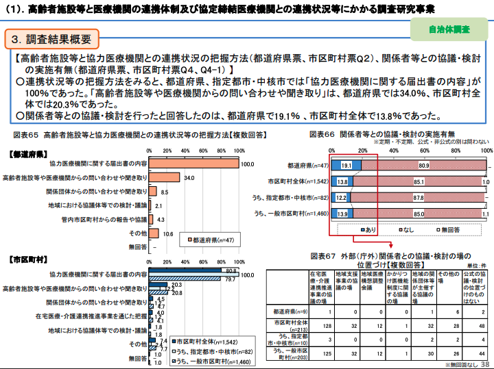 全国老人保健施設協会の東憲太郎氏は、老健施設の16.7%がまだ連携できていない現状に触れ、「調査は抽出調査であり、この割合を全数に置き換えると約180施設の老健がまだ検討も行っていないことになる」と指摘。「経過措置の期間もあと1年しかない。まだ検討も行っていない施設に対し、なぜ検討していないのか都道府県を通じて個別にヒアリングを行うべき時期に来ている」と踏み込みました。
