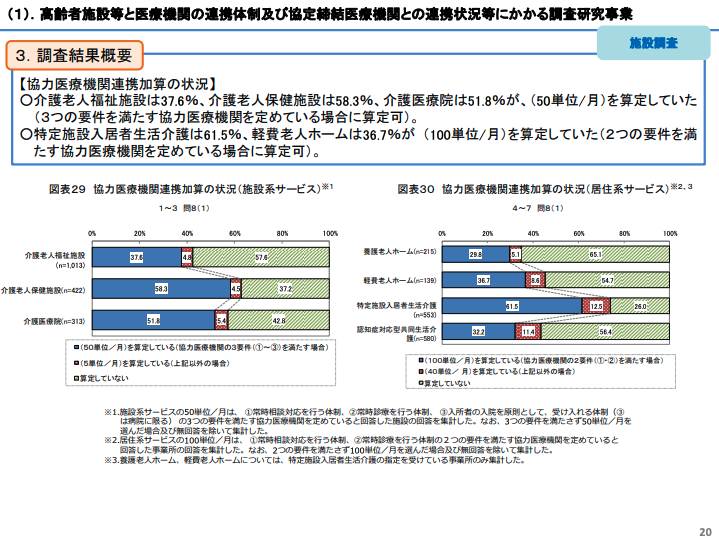 令和6年度改定で義務化された「協力医療機関の3要件」(相談対応・診療体制・入院受入)を満たす医療機関を定めている施設の割合は、介護老人福祉施設(特養)で67.9%、介護老人保健施設(老健)で83.3%、介護医療院で84.9%、養護老人ホームで60.4%でした。義務化対象の施設では昨年調査から約10ポイントの増加が確認されています。