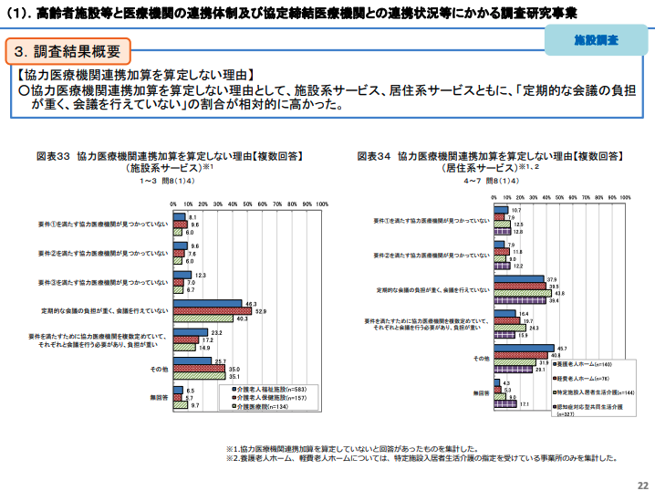 協力医療機関連携加算の算定状況も低調です。3要件を満たす場合に算定できる50単位/月の加算を算定しているのは、特養で37.6%、老健で58.3%、介護医療院で51.8%。算定しない理由として「定期的な会議の負担が重く、会議を行えていない」が施設系で40.3%~52.9%と突出しています。